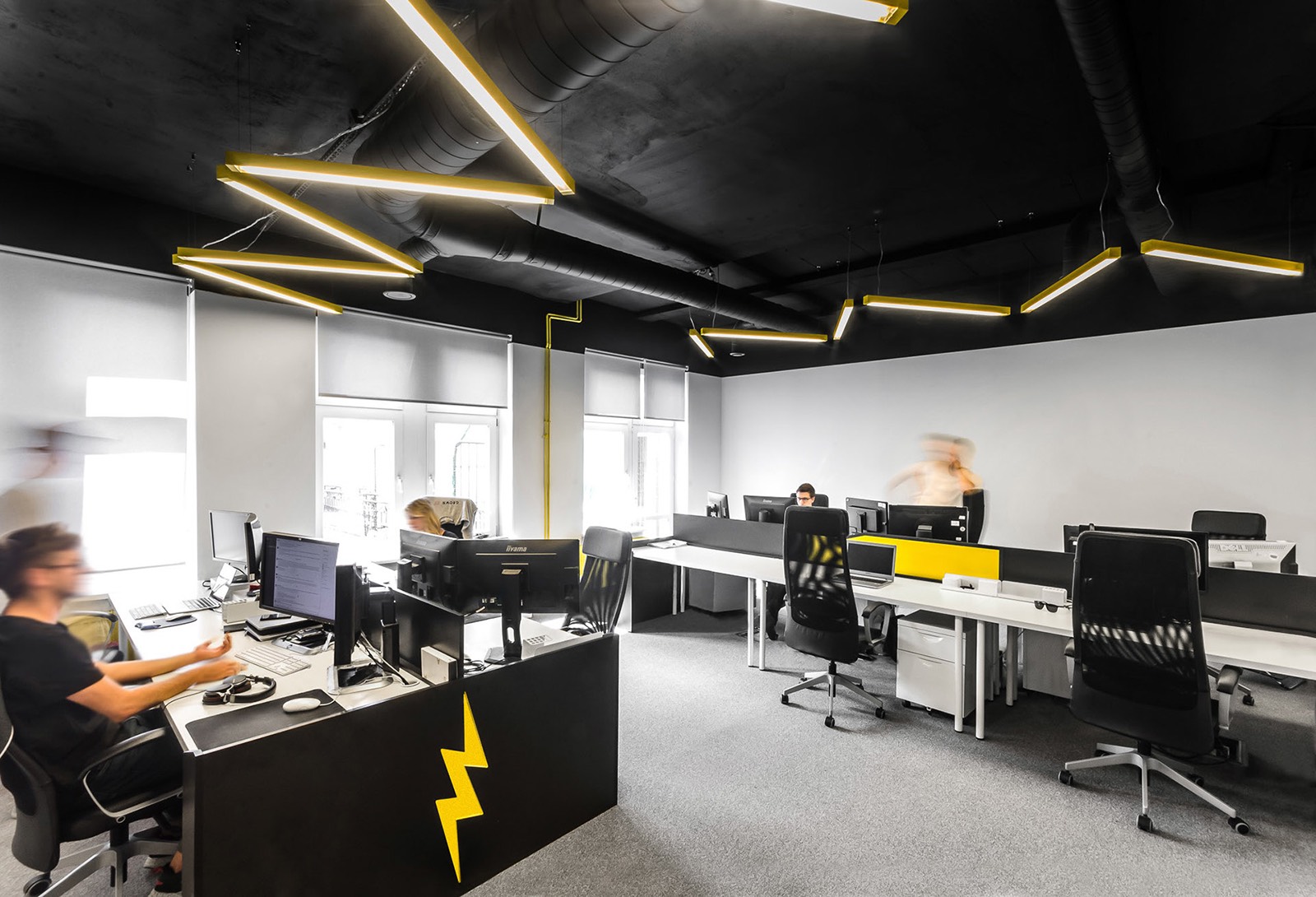 “Mobile applications developed for clients all across the world are Droids On Roids flagship product. Keeping in mind their development process, mode:lina™ designers decided to transfer the mobile sphere of programmers’ work onto the walls of their new office. The black stripe running across all spaces just below the ceiling is nothing else but a status bar, just like the one in majority of popular smartphones. The icons placed on the stripe and on doors are a visual code, which allows to identify the function of each space. Navigating this office is therefore like navigating a home screen, and is enjoyable both for the employees and the guests. Combining mobile applications environment with Droids On Roids visual identity system was the main theme of our project. Apart from elements typical for mobile applications, the interior was given yellow features, which together with lamps in a shape of a zig-zag located all across the office, correspond with a lightning in Droids On Roids’ logo. A lightning has been placed in nearly every space and it took on various roles – a decorative element on the door, detail work on the desks or phone booths’ door handles. Droids On Roids team spend a lot of time together, not necessarily only while working. In 2016 the team went on a month-long workcation to Bali. It turned out that the programmers had a number of very important rituals around celebrating the delivery of their projects or around watching films together. Therefore they needed a space which could serve both purposes – daily work and after hours events. Hence the two functions of the kitchen and the playroom were brought together in a multifunctional large space, which is always lively. The designers yet again brought in diagonal lines which feature in a lightning to achieve a dynamic division between kitchen and play areas. By completing the corridors with islands with armchairs and special soundproof booths, the office gained a large private space. There is also a nap room – a separate area with a big yellow hammock and comfortable beds. The final result is that, despite insignificant interference in the existing layout of the space, we managed to produce a friendly office for Droids On Roids team, while meeting their diverse needs and work style”, says mode:lina