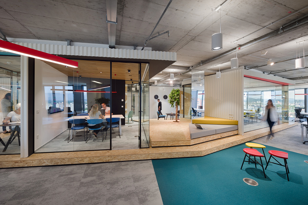 “The design team had to refresh and renew part of the offices in Crystal Palace, the tallest office building in Slovenia. The workspaces needed a fresh look, one that inspired collaborative work, agility, loyalty, and attracted talent from around the world. Also, it needed to be an extension of the company’s brand and values. The Slovene unicorn company had a clear goal in mind: to create an office where people want to be. It needed to be a vibrant office, one that by its very nature inspires creativity and dynamic social interaction, and supports the employees’ freedom to work whenever and wherever they want. In line with its brand values, the company wanted this represented through an out-of-the-box office design that would allow the office to be seen and recognized as an international hub for creativity and entertainment. Their vision was that once you saw this place, you just had to be a part of it. The first step was to look at the layout of the existing space. It had to be used as effectively as possible to allow dozens of people to work together. Because of their social and friendly working style the company needed a flexible space that could be rearranged when necessary. To implement the principles of agile work, the team needed the freedom of movement and different working space options to suit their needs. In a dynamic workplace, the key to the company’s success lies in lots of social interaction and opportunities to collaborate. However, the open workplace design needed to be balanced with spaces for focused and uninterrupted work as well. The project team incorporated new desks that could have multiple configurations, allowing for both small groups and large teams to work together. The flow of the room also became dynamic and fluid, which allowed more people in the room without feeling boxed in or secluded. The design team added a large conference room and two smaller rooms, as well as ad hoc meeting rooms and a hammock booth. The critical elements of the new office are now glass walls and an open plan that makes everyone feel like a part of a whole, even when in meetings. Raised flooring, flake boards, and bright colours add to the atmosphere of playfulness, creativity, and the unexpected, making it feel like a “home away from home.” The workplace is now an environment that supports innovation, design, and methodical planning. No matter your personality or work style, the redesigned office space now makes you feel good with different corners suited for different moods. People can work however and wherever they want, individually or in a group. The new office space also allows freedom from logistical constraints, technical setbacks, or communication issues.”