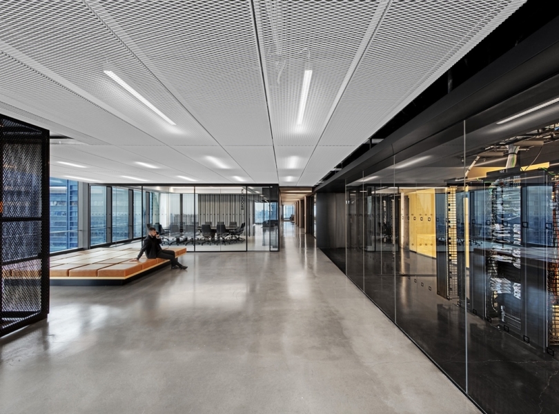 The main office space is also split across two floors with angled timber slats creating a standout ceiling feature and defining key working areas. Lockable storage is provided through smart lockers, separate glazed c-suite offices provide privacy, whilst free-standing booths also offer quiet space for focus or small group meetings. A small gym provides a space for exercise and wellbeing and is not visible from the office area.”