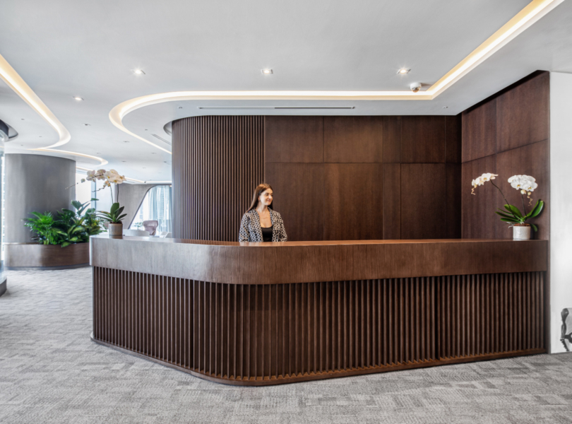 Stepping inside, brand identity is immediately established, with bespoke signage in the entryway. The team lifted the firm’s colour palette from a dark black to a lighter grey, with orange features, for a welcoming entrance that remains on brand.