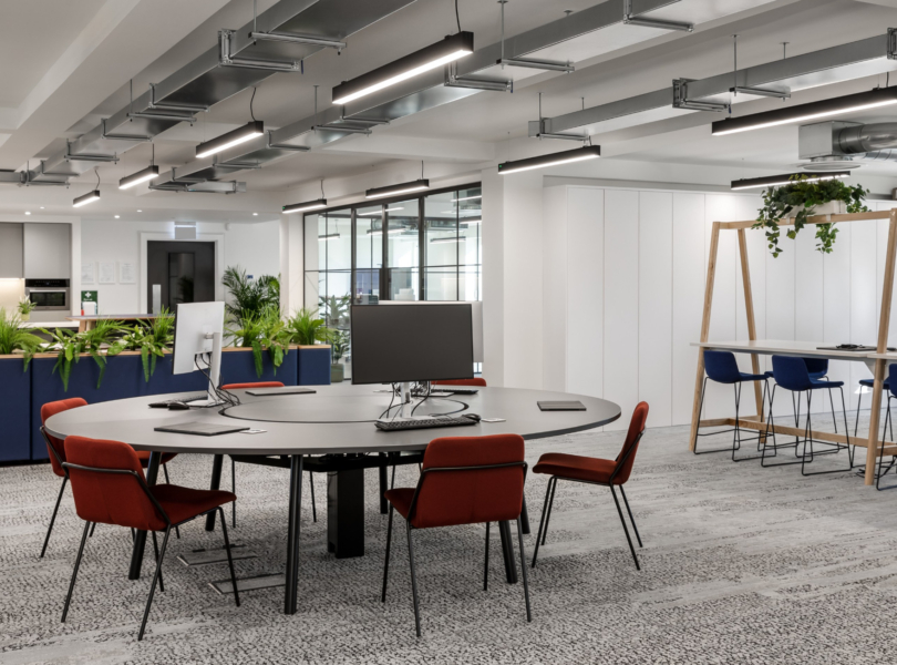 A custom mural by Hibaaq Ibrahim is the anchor as you enter the workspace. The mural was commissioned to bring energy and color into the space as you transition from the gathering areas into the individual workspace area. The space is allocated to different activities. 1/3 of the space is for gathering and formal meetings, 1/3 of the space is for team collaboration and last third is for heads down individual work. This allocation of space supports a hybrid team and allows for growth in the future without adding more space.”