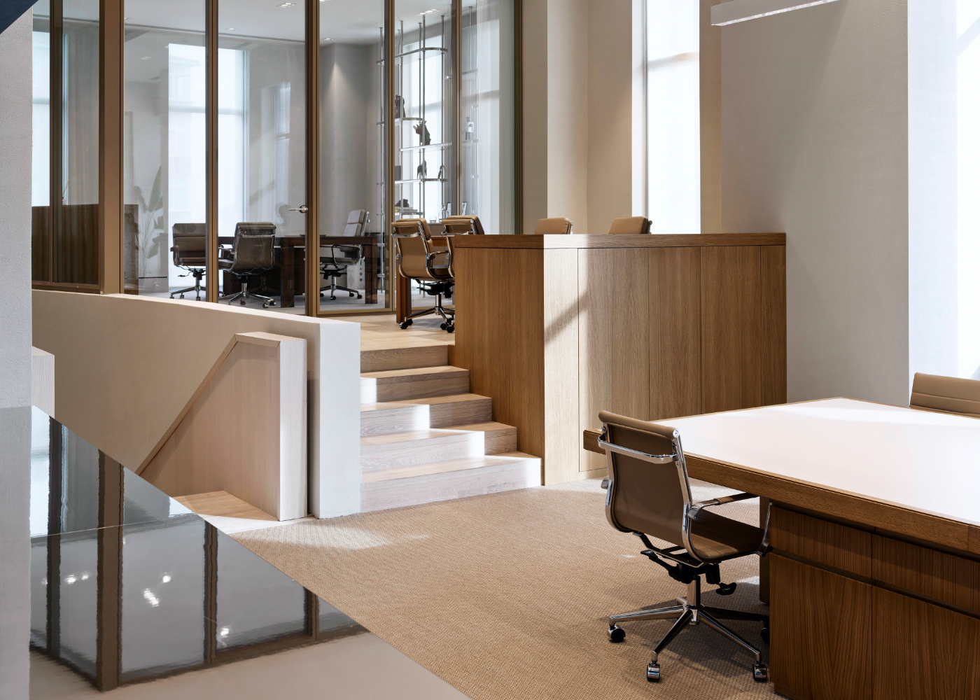 “Özlenir Headquarter, designed by URBANJOBS, involves the transformation of a complex and multi-faceted structure, located on the ground floor of a multi-story residential building in Istanbul, into a headquarters office for a textile importer and retailer. The headquarter carries a spacious, minimalist, and at the same time, bold design style. The design goal for the project was to adopt a “clean desk policy,” aiming to create an interior where no computers or personal stationery items are visible. Fixed and mobile furniture elements were integrated to achieve this concept. The project was shaped around a design philosophy emphasizing the balance between linear clarity, material layering, and functionality. The architecture focuses on directing light within the space, creating depth with reflective surfaces, and organizing materials in a fluid rhythm.