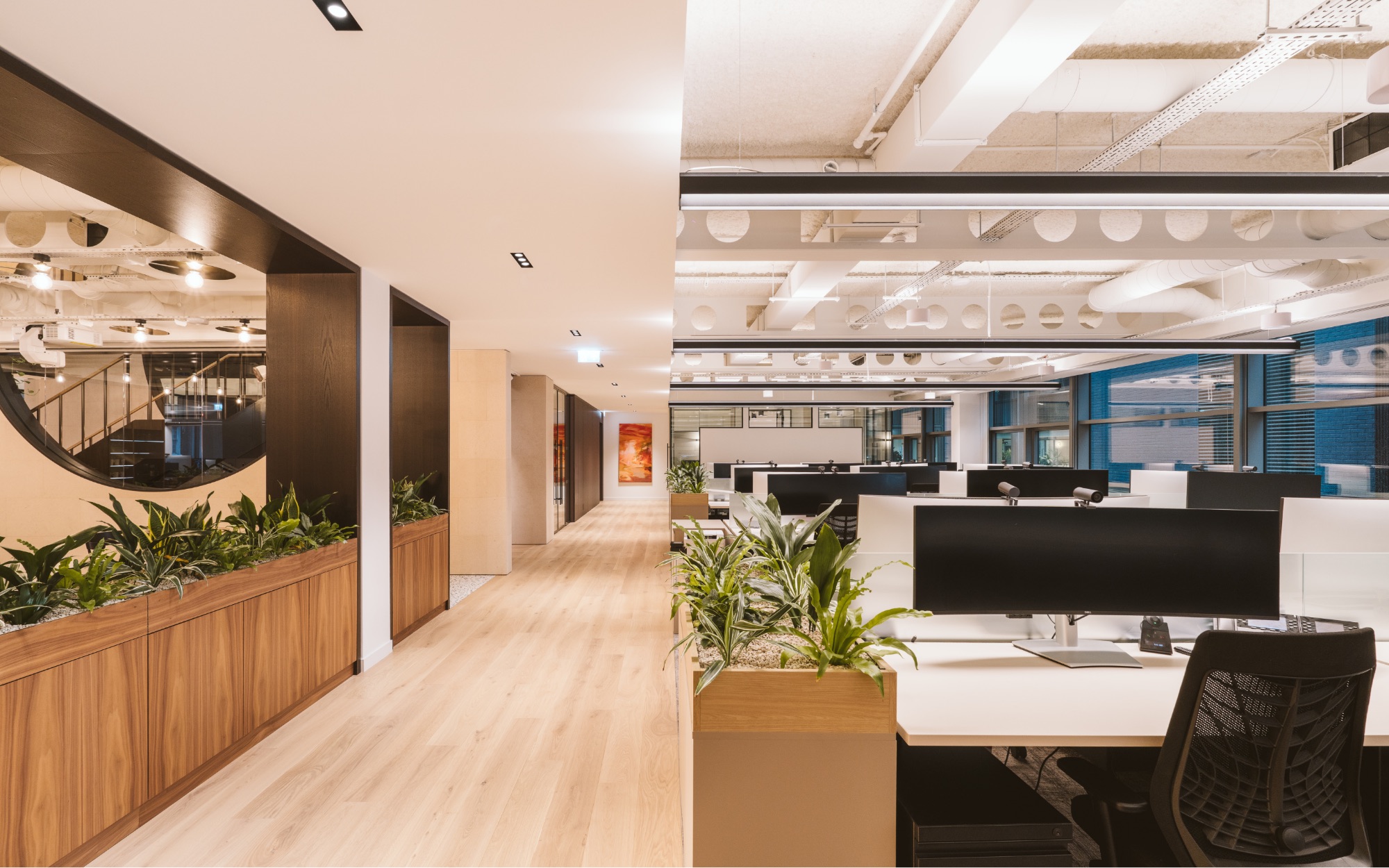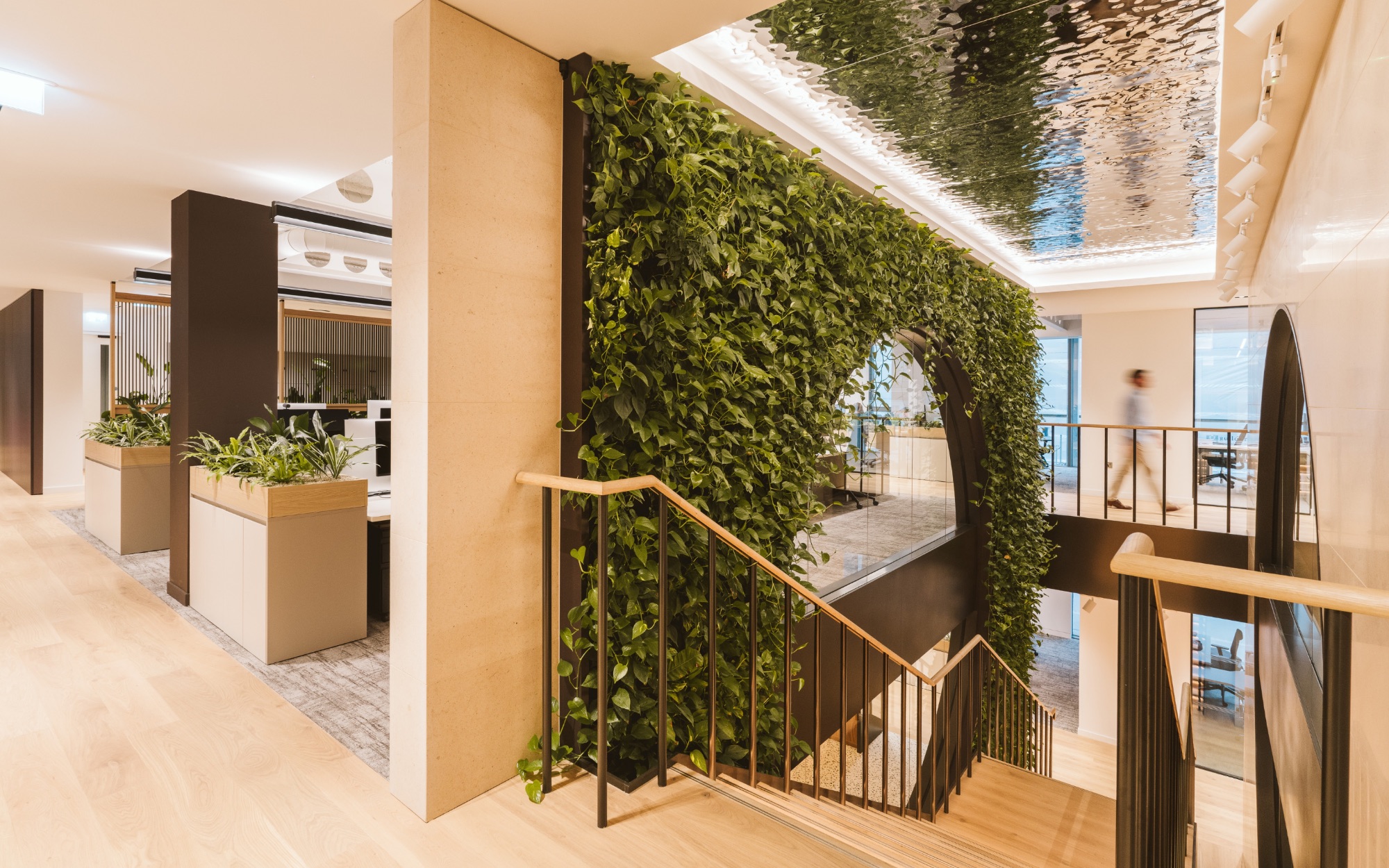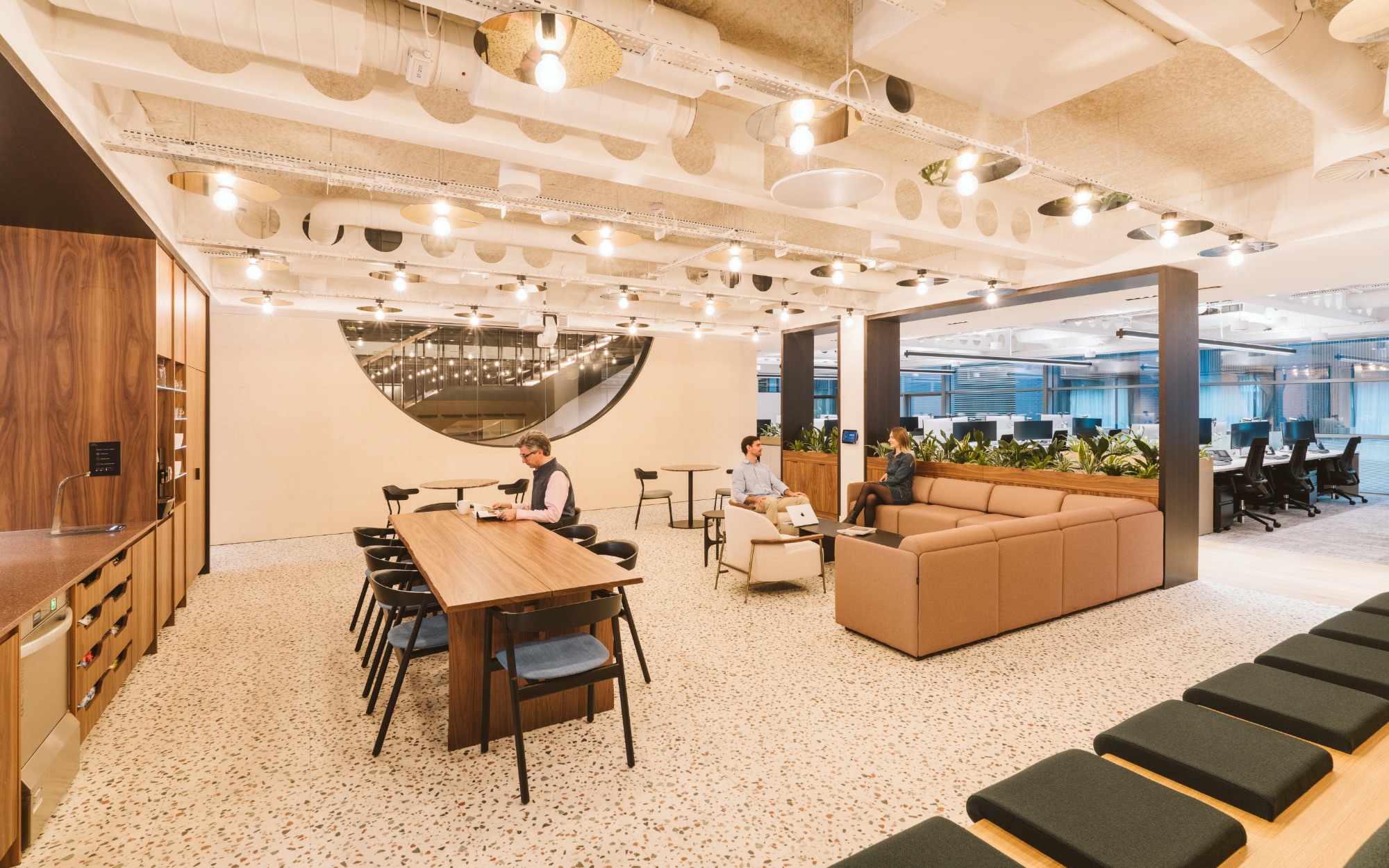 Concealed LED lighting traces its form, while a mirrored ceiling overhead creates the illusion of an inverted ripple pool, creating a dramatic sense of height and evoking the core motif of fluidity. Circular windows allow sightlines to pass through the space, reinforcing transparency and openness. A lush biophilic living wall brings organic vibrancy to the feature. This visual centrepiece seamlessly brings the two floors together as one space, fostering fluid movement, impromptu connections, and a cohesive culture.