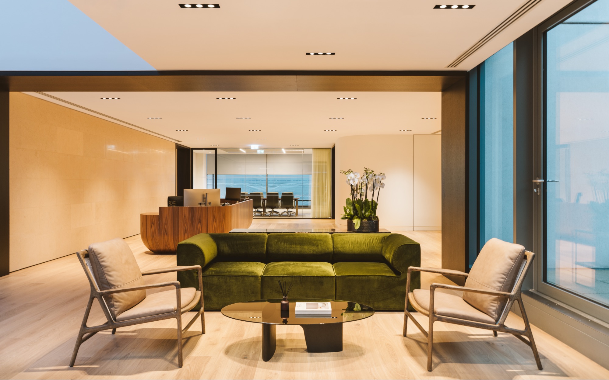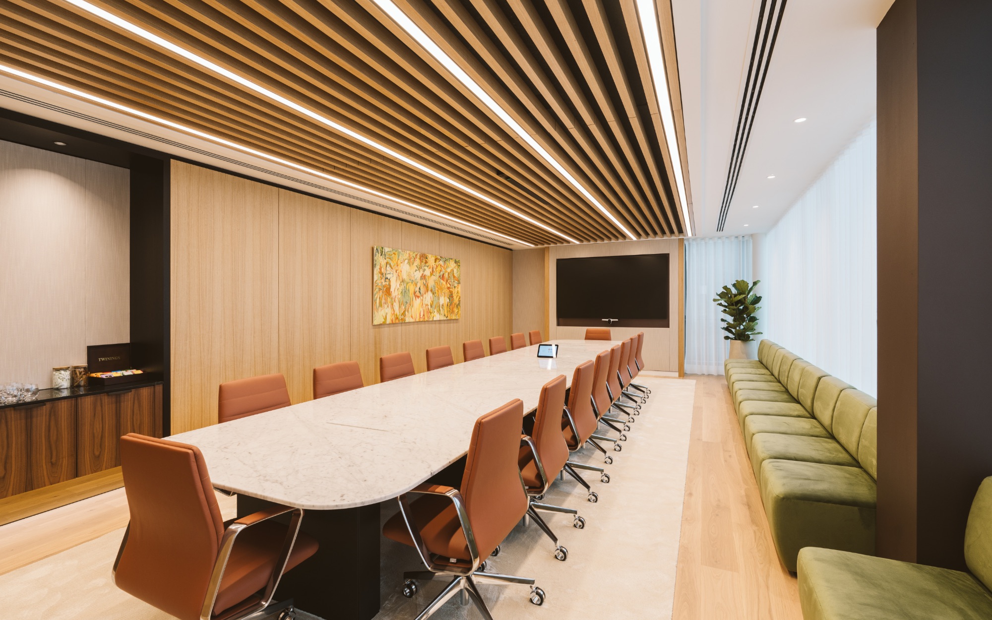 A prominent marble table spanning several metres sits in the boardroom to create a bold, sophisticated space, complemented by leather chairs and veneer finishes. The team managed the installation process which progressed seamlessly, a major achievement given the physical spatial constraints.