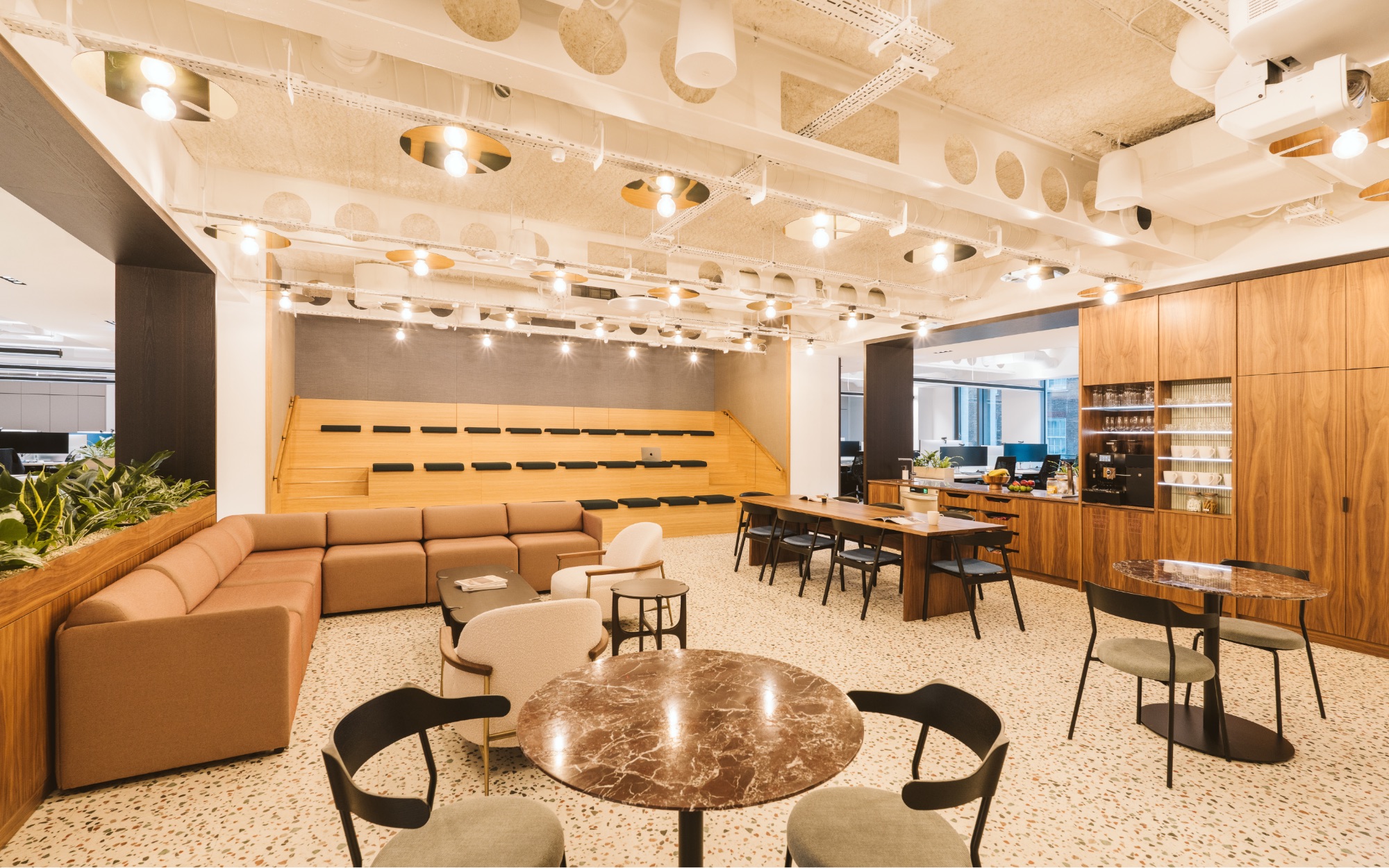 The Peldon Rose Enterprise team partnered with Savills Workplace & Design under the creative direction of Beau Becquart, Associate Director – Architect, to bring this vision to life. Together, the team shaped a three-floor workspace anchored by meaningful interaction and seamless movement, punctuated by a sculptural staircase, a welcoming social café, and breakout settings that unfold through fluid circulation routes. The result is a 22,000 sq ft office infused with warmth, connection, and a design language inspired by Mayfair’s rich architectural heritage.